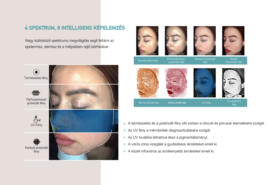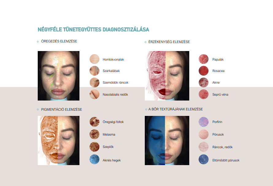 Öregedés, érzékeny bőr, pigmentáció, bőr textúra, bőr tónus diagnosztika - ezek mindegyikére tökéletes megoldást nyújt a Caldera Arcelemző gép!
