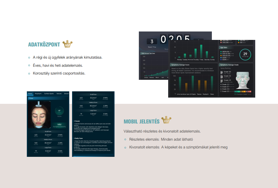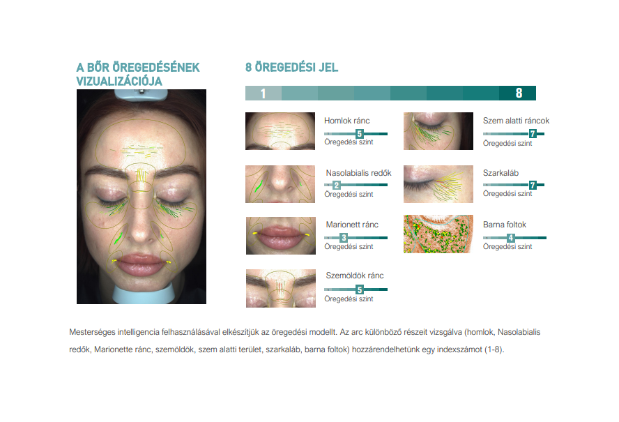 Az összegyűjtött adatok alapján tudományos elemzést és számításokat végezve valóságos és összehasonlítható eredményt kapunk. Ezáltal hitelesen értékelhető a kezelés eredménye. A professzionális elemzéssel és annak bemutatásával fokozható a vendég bizalma. Valamint, AI segíti az öregedési fázisok meghatározását.